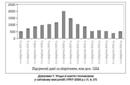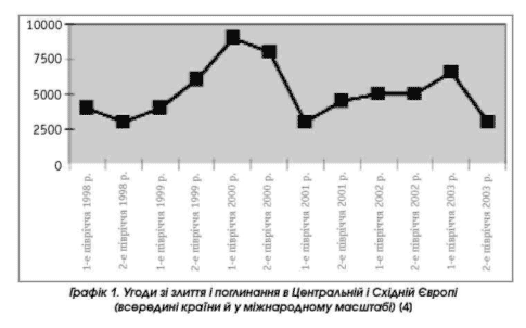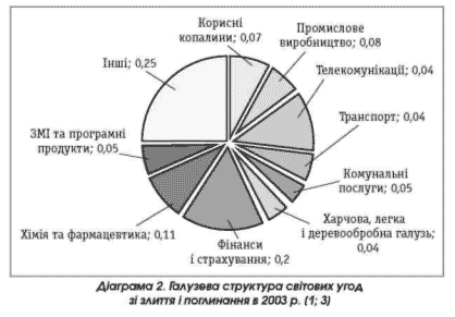 витрати й іти з непрофільних для себе сфер діяльності [15]. Однак вже в першому півріччі 2003 року на ринку злиттів і поглинань позначився істотний ріст. Особливо це стало помітно після завершення воєнних дій в Іраку. Прагнення компаній до здійснення угод зі злиття і поглинання зросло, і ситуація на ринку покращилася. Дані з найбільших міжнародних угод зі злиття і поглинання, які були укладені 2003 року представлені в табл.1. Початок 2004 року позначений сплеском світової активності в галузі злиття і поглинання. Тільки за два перших місяці оголошено про угоди на суму понад 300 млрд дол. [8]. Поліпшення ситуації у світовій економіці призвело до різкого збільшення кількості й обсягу угод зі злиття і поглинання компаній. Почався 2004 рік з покупки J. P. Morgan Chase за 58 млрд дол. чи-кагського BankOne. Наприкінці січня одна з провідних стільникових компаній світу — британська Vodafone — оголосила про намір придбати американську телекомунікаційну компанію AT&T. Спочатку за AT&T пропонувалося близько 30 млрд дол., однак фахівці впевнені: впродовж декількох тижнів ціна зросте, адже інтерес до покупки AT&T виявила не тільки Vodafone, а й інші компанії. Приблизно тоді ж стало відомо про намір французької фармацевтичної компанії Sanofi-Synthelabo придбати іншу французьку компанію — Aventis. За неї запропонували ледве більше 63 млрд дол., однак керівництво Aventis відмовилося: ціна була занадто низькою. Так що і тут можна сподіватися на істотне підвищення вартості угоди — до 80–90 млрд доларів. Угод такого масштабу не було з кінця 90-х років, і більшість експертів думають, що спад у цьому сегменті інвестиційного бізнесу минув [9]. Загальносвітовий обсяг злиття і поглинання збільшився з 1,19 трлн дол. у 2002 р. до 1,26 трлн на початку 2004-го. Лідером у сфері злиття і поглинання знову стали США, загальна сума угод яких зросла з 432 млрд дол. до 490 млрд. Серед найбільших угод у цій сфері варто виділити об'єднання Bank of America з Fleet Boston Financial (48 млрд дол.), злиття компаній з виробництва медичного устаткування WellPoint Health Networks і Anthem, американського телевізійного холдингу NBC з розважальними програмами Vivendi Universal у США, а також звукозаписних компаній Sony Music і BMG. В Азії було зареєстровано два великих злиття: японських торгових домів Nissho Iwai і Niehimen (вартість угоди — 7 млрд дол.); австралійської News Corporation c американською компанією Hughes Electronics (6,5 млрд дол.) [21]. У Центральній і Східній Європі (за винятком Росії і країн СНД) вже 2003 року спостерігається невеликий ріст загальної вартості угод злиття і поглинання (всіх угод, у яких Центрально- і Східноєвропейські компанії були покупцями або об'єктами придбання) у порівнянні з 2002 роком. Вартість угод, укладених компаніями Центральної і Східної Європи, збільшилася на 3% — з 8950 млн дол. США в 2002 році — до 9196 млн дол. США 2003 року. Однак цей приріст досягнутий переважно у першому півріччі 2003 року, коли вартість угод зросла на 39% порівняно з першим півріччям 2002 року; у другому півріччі загальна вартість угод знизилася на 32% — з 4 522 до 3 060 млн дол. США [6] (графік 1). Галузева структура угод зі злиття і поглинання за минулий рік представлена на діаграмі 2. Консультанти зі злиття і поглинання стверджують, що нині уже готові для консолідації фінансів, які обслуговують промисловість і охорону здоров'я. У Сполучених Штатах Америки, де сфера фінансових послуг, на думку економістів, фрагментована, кількість угод з