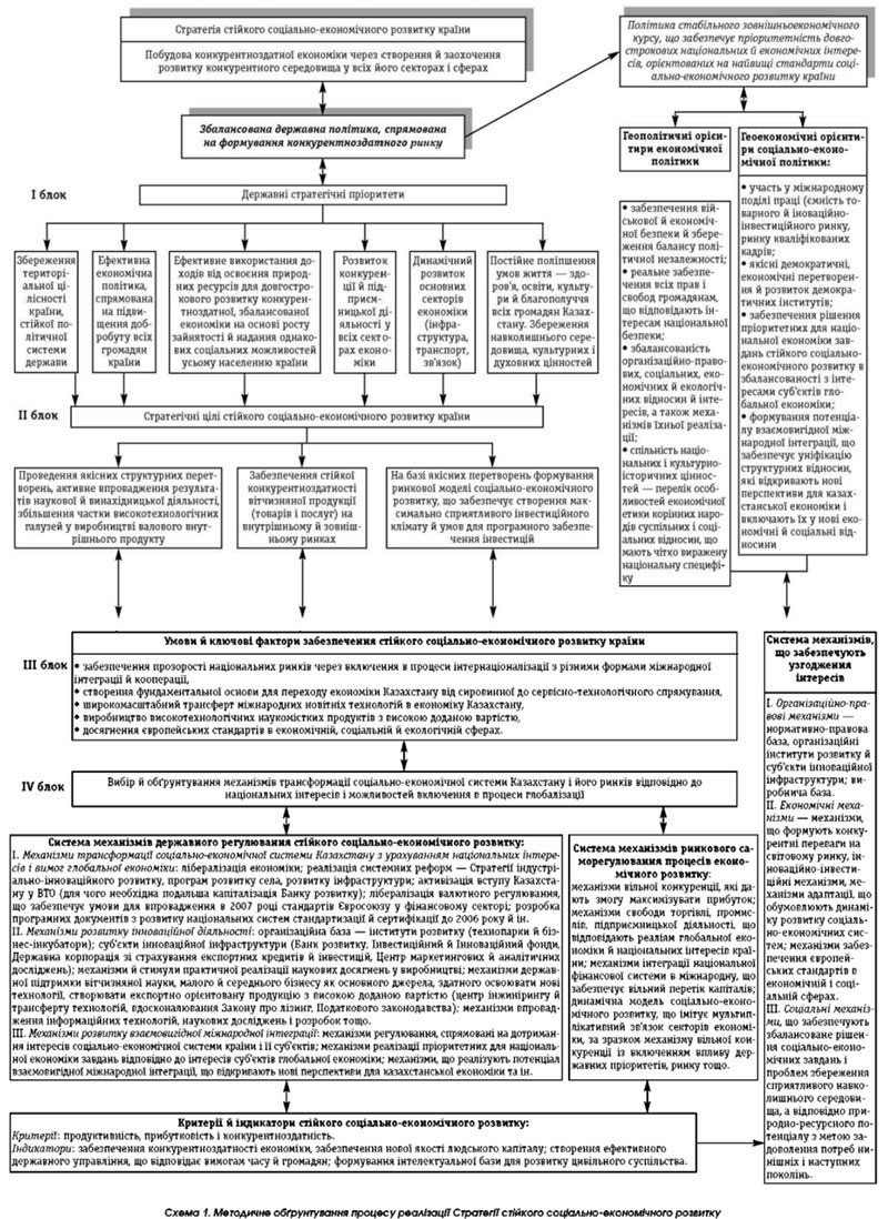 Загалом логіка й зміст процесу реалізації Стратегії стійкого соціально-економічного розвитку представлений на схемі 1. Процес соціально-економічного розвитку має об'єктивний характер і підпорядкований певним закономірностям, правилам і ритмам. Однак у процесі реалізації не виключена можливість певних відхилень від заданих правил і параметрів (у просторі й у часі), що характеризується не тільки свободою вибору суб'єктів економіки і поведінкою у різних економічних ситуаціях, а й вимогами світового, глобального ринку. У цих випадках кожен регулюючий вплив має бути підсумком аналізу взаємодії системи ринкових відносин. Література 1. Ведута Е. Н. Стратегия и экономическая политика государства. — М., 2003. — С. 11–15. 2. Седлак Я. Мировая экономика: возможность неожиданных потрясений // Проблемы теории и практики управления. — 2001. — № 5. — С. 8–14. 3. Назарбаев Н. А. Казахстан-2030. Послание Президента страны народу Казахстана // Казахстанская правда. — 1997. — 11 октября. 4. Кастельс Мануэль. Информационная эпоха: экономика, общество и культура. — М., 2000. — С. 58–79. 5. Материалы конференции «Инновационный Казахстан» // Панорама. — 2004. — 26 березня. — № 12. 6. Назарбаев Н. А. Ставить высокие цели // Казахстанская правда. — 2004. — 4 ноября. — № 251. |