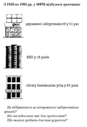 Під час передвиборних кампаній регулярно звучать обіцянки боротися з інфляцією, поліпшувати соціальні інститути і підтримувати заходи для поліпшення екологічної ситуації. В умовах сучасної грошової системи здійснити все це в комплексі неможливо. Насправді всі ведуть боротьбу «спиною до стіни». Замість поліпшення — ситуація погіршується при наближенні до ділянки прискореного росту кривої експотенційного росту. Замість поліпшення соціальної й економічної ситуації, бюджетні витрати на ці цілі насамперед потрапляють під скорочення. І консервативні, і прогресивно налаштовані політики практично мають дуже невеликі можливості для проведення дієвих реформ у межах існуючої системи. Клаус фон Донан'ї — німецький політик, який не тільки знає про це, а й намагається здійснити зміну грошової політики. Він упродовж багатьох років є бургомістром Гамбурга. У своїй заяві від 23 лютого 1983 р. він підкреслив: «Якщо ми допустимо подальше збільшення суспільної заборгованості в межах країни, регіонів і громад, як це відбувається нині, то навіть при подальшому зниженні процентних ставок «ми не тільки упустимо можливість маневру для здійснення додаткових заходів, а й взагалі втратимо здатність проводити колишню політику /.../ Збільшення обсягу фінансування бюджетних кредитів насамперед призводить до виникнення двох проблем: з однієї сторони — бюджетна заборгованість у майбутньому за відсотками і платежами, з іншої — небажані наслідки перерозподілу грошей, що неодмінно відбуватиметься на користь власників грошових капіталів». Фон Донан'ї пропонує емісійному банкові надавати федеральним органам і землям кредити без відсотків і платежів для здійснення соціальних і екологічних проектів, щоб уникнути економічно безглуздої і неприйнятної бюджетної заборгованості в майбутньому. На рис. 8 показано, наскільки тісно в межах широко розгалуженої і диверсифікованої економіки кожна галузь діяльності пов'язана із суміжними. Скорочення в одній із них неминуче спричиняють зміни в системі як у єдиному цілому. Якщо відбувається ріст державної заборгованості або підвищення процентних ставок, то відбувається приплив грошей до тих, чиє майно вкладене у гроші. Водночас трудова частина населення втрачає гроші, необхідні для задоволення потреб. Насамперед це впливає на ринок робочої сили, податкові надходження й екологію. Держава з високим рівнем заборгованості, із компенсацією зниження доходів неминуче стикнеться з продовженням «ланцюжка проблем». Система нейтральних грошей, навпаки, могла б забезпечити зниження рівня державної заборгованості, протидіяти подальшій концентрації грошей унаслідок дії процентного механізму і забезпечити стабільний обмін товарами і послугами на вільному ринку. Якщо ситуація у високорозвинених країнах нам здається важкою, то поглянемо на країни третього світу, які найбільше страждають від роботи сучасної грошової системи. З однієї сторони — банки Німеччини і США збільшують резервні фонди, готуючись до фінансового банкрутства своїх боржників у країнах, що розвиваються, з іншої — саме промислово розвинені країни здійснюють імпорт капіталу з країн, що розвиваються, а не навпаки. Для погашення старих кредитів надаються нові кредити, і це лише затягує і підсилює міжнародну кризу заборгованості. Необхідність не