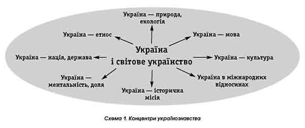 Завдання курсу: на основi наукової джерельної бази, всебiчного, системного вивчення й висвiтлення генезису України й українства, самого українознавства як наукової системи: а) виявити досвiд поколiнь та iсторичнi уроки розвитку етнонацiї, української природи, мови, держави, культури, людини; б) сприяти аналiзовi тенденцiй, закономірностей, причин та наслiдкiв розвитку й проблем сучасностi; в) формувати питомі риси громадян; г) готувати поколiння до самостiйного життєвого вибору шляху та перспектив майбутнього, пiзнання й самопiзнання, творення й самотворення особистостi, схильної i спроможної бути в гармонiї з iншими людьми, з довкiллям, із власним «Я» (внутрiшнiм свiтом) i поєднувати особистi iнтереси з громадськими, нацiонально-державними та загальнолюдськими; сприяти виробленню високих суспiльних, державних, гуманiстичних, духовно-культурних iдеалiв, визначенню морально-етичних та естетичних критерiїв i принципiв життєдiяльностi людей мудрого серця i гуманного розуму (iнтелекту), патрiотiв-професiоналiв свiтового рiвня, творців засад громадянського суспільства в національній державі. Методологiчні засади українознавства визначаються його принципами: системності, історизму, науковості та інтегративності знань; методами: аналiзу й синтезу; поєднання вiтчизняного й зарубiжного досвiду; iндукцiї і дедукцiї; єдностi професiоналiзму й патрiотизму, знання i любовi; постiйного спiввiднесення матерiалiв (досвiду) рiзних концентрiв українознавства. Фундаментом українознавства є цілісна система знань археології та етнології, фольклористики і лінгвістики, антропології й демографії, людино-, суспільство-, природо- і релігієзнавства, історії, філософії, культурології та ін. наук. Змiст, структура курсуУкраїнознавство включає в себе крає-, країно-, природо-, суспiльство-, людино-, народознавство, але не як окремi предмети, а як елементи унiверсальної цiлiсностi. Поняття «Україна» й «українство» розкриваються й осягаються через взаємопов'язаний еволюцiйно-синхронний й дiахронний розгляд концентрiв: Україна — етнос; Україна — природа, екологія; Україна — мова; Україна — нація, держава; Україна — культура (матерiальна, гуманітарно-духовна: релiгiя, фiлософiя, мистецтво, освiта, наука; право; валеологiя; вiйсько); Україна в мiжнародних вiдносинах; Україна — ментальнiсть, доля; Україна — iсторична місія, тобто українознавство постає як цiлiсна система самопізнання, виховання й навчання, єдностi знання, любовi і творення. Кожен, хто відчуває потребу зайнятися українознавством, найперше відчує два гострі контрасти: українознавча наука існує давно, а термін «українознавство» (отже, його осмислення на рівні поняття) — з'явився лише в XIX столітті. Вражає також надзвичайно високий (світовий) рівень теорії та методології українознавства у двадцятих роках XX ст.: тоді воно мало солідну джерельну, історико-методологічну базу, розроблену на рівні праць найвидатніших учених Всеукраїнської академії наук (М. Грушевський, В. Вернадський, А. Кримський, С. Єфремов, Д. Багалій, І. Огієнко), а наприкінці XX ст. опинилося в стані ідеолого-політичної боротьби і, відповідно, суперечливої інтерпретації, методологічної безпомічності. Коли одні дослідники ставили українознавство на ґрунт наукових принципів і видали загалом корисні праці енциклопедичного типу (1916 р. — група авторів, очолюваних Ф. Во