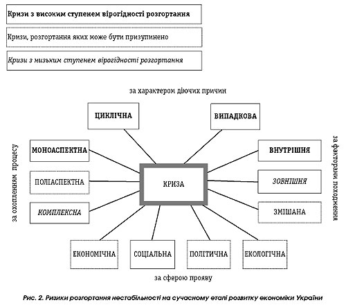 Джерело: Держкомстат. * Січень–вересень. ** Жовтень до грудня 2004 р. *** Динаміка показників за 2000–2003 рр. уточнена у зв'язку з перерахунками чисельності населення за результатами Всеукраїнського перепису населення 2001 року. **** Січень–червень. Крім того, на темпи зростання також вплинуло уповільнення зовнішнього попиту через погіршення кон'юнктури та загострення конкуренції на світових ринках, зниження світових цін на продукцію металургії. Зростаючий потенціал внутрішнього споживчого попиту, який підтримували високі темпи зростання доходів населення та розвиток внутрішнього виробництва споживчих товарів і послуг, не зміг компенсувати уповільнення експортних поставок та інвестицій в основний капітал і забезпечити прискорений розвиток таких галузей, як будівництво, металургія і машинобудування. Криза як специфічна фаза циклу, що характеризується порушеннями рівноваги, зміною звичного устрою або функціонування, є прогнозованою, адже циклічність як така відтворює закономірність розвитку будьякого процесу. Відповідно, криза, викликана об'єктивними циклічними процесами в економіці, не передбачає раптових коливань подібної амплітуди, а, навпаки, характеризується тривалістю фаз зародження та розгортання, які формуються на попередніх етапах. Таким чином, проблеми розгортання кризових явищ в Україні мають досить специфічні характеристики. З одного боку, кризові явища пов'язані з моделлю економічного розвитку держави та можливостями здійснення відчутних економічних реформ. З іншого — кризові явища відрізняються певною специфічністю залежно від сфери їх прояву. Зокрема, валютна криза як складова кризи економічної на українському ґрунті характеризується: • економічно необґрунтованим знеціненням або подорожчанням національної валюти; • різким коливанням валютних курсів; • заміною грошової одиниці або її вартісної основи; • значним обсягом спекулятивних операцій валютою, швидких і значних за масштабами припливів і відпливів валютних резервів; • різкою незбалансованістю міжнародних розрахунків; • погіршенням міжнародної валютної ліквідності тощо. Крім того, у валютній сфері нестабільність проявляється проблемами внутрішньої та зовнішньої боргової залежності країни, а прояви нестабільності у банківській сфері — радше проблемами психологічного характеру, що виражаються в недовірі до банківських установ у період низької прогнозованості економічного розвитку (курсу) країни, а отже, у масовому вилученні коштів навіть попри економічну доцільність (втрата відсотків при достроковому вилученні внесків). Тобто особливість банківської нестабільності полягає у певній хаотичності її виникнення. Макроекономічні базові показники — рівень інфляції, ВВП, граничні показники як внутрішнього, так і зовнішнього боргу перестають на певний час відігравати роль індикаторів стабільності, найважливішими виявляються настрої чи то спекулянтів, що свідомо йдуть на корекцію курсу національної грошової одиниці, чи вкладників, яких об'єднує так звана «стадна поведінка». Прогнозувати ризик виникнення в Україні кризи будь-якого типу — або валютної, або банківської — внаслідок впливу світової (регіональної) фінансової кризи завчасно. Бо за основними критеріями, що визначають ступінь інтегрованості у глобалізовану світову еко