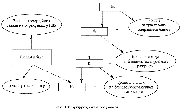 Для визначеня грошової маси беруть за основу грошові агрегати — специфічну класифікацію платіжних коштів за рівнем їх ліквідності. Грошовим агрегатом називають особливу групу ліквідних активів, яка є альтернативним вимірювачем грошової маси. Грошові агрегати — зобов'язання банківської системи нефінансовим секторам: готівка, депозити до запитання, строкові депозити та заощадження. Розвиток зазначених депозитів відображає стан монетарної політики. Грошові агрегати протиставляються чистим зовнішнім активам (обчисленим у національній валюті) та чистим внутрішнім кредитам. Грошова база — сума готівки в обігу, готівки в сейфах і касах банків та резервах комерційних банків на їх рахунках у НБУ. Обов'язкові резерви. Ці гроші не беруть участі у кредитному банківському обороті, не збільшують масу грошей в обігу, а є тільки базою для її збільшення. Національним банком України визначено чотири грошові агрегати (див. рис. 1). Грошовий агрегат М1 складається з агрегату М0, розрахункових рахунків і поточних депозитів у національній валюті. Параметр М0 включає готівку в обігу (в касах підприємств і організацій та на рахунках у населення). Грошовий агрегат М2 включає параметр М1, строкові депозити та валютні кошти. Строкові депозити складаються із залишків на строкових (до трьох років) рахунках за вкладами населення та депозитів підприємств і населення на розрахункових рахунках у комерційних банках. Грошовий агрегат М3 включає параметр М2, кошти клієнтів за трастовими операціями банків та цінні папери власного боргу банків. Грошові агрегати різняться між собою за рівнем ліквідності. Останню властивість розуміють так: це можливість використання певного активу як засобу обігу або перетворення активу на кошти обігу та його здатність зберігати свою номінальну вартість незмінною. Абсолютно ліквідними вважаються гроші параметра М1. До високоліквідних грошових активів належить також грошовий агрегат М2. На думку економістів, цей параметр грошової маси тісніше пов'язаний зі швидкістю обігу грошової маси, реальним національним продуктом і цінами. Поведінка грошових агрегатів у консолідованій банківській системі може бути пов'язана з грошовою базою центрального банку через грошовий мультиплікатор, обчислений як відношення М2 (або іншого грошового агрегату) до грошової бази — суми готівки, що утримується поза банківською системою та загальними резервами комерційних банків, тобто суми мінімальних обов'язкових і надлишкових резервів, включаючи готівку в сейфах. Обсяг готівки в обігу залежить від монетарної політики, платіжної дисципліни, інфляційних очікувань і швидкості обігу готівки. Кожен агрегат має певне призначення у практиці управління грошовим оборотом, а разом вони дають цілісну картину структури та динаміки грошової маси і грошового обороту. Грошові агрегати різняться не тільки кількісно, а й якісно. Так, агрегат М0 виражає масу грошей, яка перебуває безпосередньо в обігу, реально виконуючи функції засобів обігу та платежу. Вона найтісніше пов'язана з товарною масою, що проходить процес обміну, і безпосередньо впливає на ринкову кон'юнктуру. Саме тому цей агрегат повинен бути об'єктом найактивнішого регулювання. В інших грошових агрегатах ураховують також нагромадження грошей у різних організованих формах. Ці гроші тим