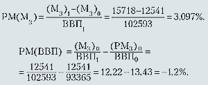 Кількість же грошей в обігу позначається на обсязі випуску продукції, рівні цін і зайнятості. Показники швидкості обороту грошової масиРозглядаючи ці показники грошової маси, розрізняють швидкість обігу готівки та швидкість обігу агрегату М1. Швидкість обігу обчислюється як відношення місячного (квартального, річного) ВВП до обсягу М0 і М1 на середину періоду та множиться на 12 (відповідно 4 для квартальних та 1 для річних даних). Темпи зростання агрегату впродовж періоду вважають сталими. Обсяг готівки і М2 на середину періоду розраховується на підставі даних про готівку на кінець звітного періоду та агрегату М2, включаючи строкові депозити в іноземній валюті, на кінець звітного періоду. Депозити в іноземній валюті перераховують за обмінним курсом, який є середнім між аукціонним і міжбан-ківським, з одного боку, та некомерційним — з іншого. Швидкість обігу грошей визначається за формулою: Ш = ВВП / М де ВВП — номінальний валовий внутрішній продукт; М — загальна маса грошей, що визначається як середні залишки грошей за певний період. Цей показник характеризує, скільки в середньому за рік оборотів здійснила грошова маса. На підставі цих даних можна визначити в базисному і звітному періодах: