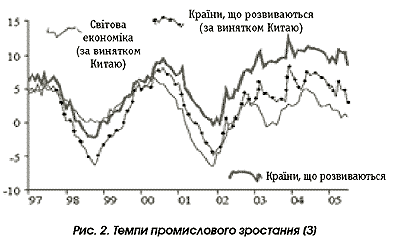 Загалом зростання світової економіки у 2005 р. помітно сповільнилось, знизившись до рівня 3,2%, який у 2004 р. становив 3,8% (див. рис. 1). Зазначене сповільнення мало повсюдний ха рактер і спостерігалось майже у всіх регіонах світу, що пояснюється цілою низкою причин, серед яких зростання цін на нафту, обмежені можливості ресурсопостачальних галузей, а та кож жорстка монетарна політика в США та ін ших високорозвинених країнах. В останніх по казник економічного розвитку у 2005 р. стано вив 2,5% проти 3,1% у 2004 році. Рівні промислового виробництва та торгових потоків відрізнялись невисокими показника ми. Так, наприклад, зростання промислового виробництва впало з 5,2% у 2004 р. до 1,5% в середині 2005 р. (див. рис. 2). У США в 2005 р. темпи економічного росту не перевищили 3,5% порівняно з 4,2% за результатами 2004 року. Та ке зменшення темпів зростання було спричи нене низьким рівнем довгострокових відсотко вих ставок, які стимулювали внутрішній по пит, та девальвацією американського долара, яка була проведена у кілька етапів і сприяла покращенню позицій експортоорієнтованих галузей унаслідок підвищення їх конкурентос проможності. В європейських країнах також спостеріга лось значне уповільнення темпів росту до 1,2% на рік (в Єврозоні цей показник становив 1,1%), що пояснювалось слабкою забезпеченіс тю нафтовими ресурсами, а отже, реакцією на стрімке підвищення цін на продукти нафтопе реробки та гнучкістю напрямів макроеконо-мічної політики. В Японії, за оцінками експер тів Світового банку, ріст ВВП становив 2,3%. Зростання внутрішнього попиту та рівнів до ходів населення, спричинене ефектом звужен ня ринку праці та зменшенням промислової реструктуризації, компенсували сповільнення попиту на імпорт з боку Китаю. Надалі очіку ється, що підвищення цін на нафту, що відбу лось у 2005 р., відобразиться у зниженні на 0,25% темпів світового економічного зростан ня у 2006 році. У США зростання, імовірно, ут римається на рівні 2005 р., а негативні ефекти очікуваних курсових коливань та подальшого подорожчання нафти будуть частково компен совані черговим сплеском обсягів експорту та ростом обсягів державного фінансування, спрямованих на подолання згубних наслідків, спричинених ураганами у 2005 році. В Європі, попри дію чинника високих цін на нафту, прог нозується зростання економічної активності як реакція на встановлений низький рівень відсоткових ставок, високе накопичення інвес тицій та нівелювання негативних ефектів ре вальвації євро. Щодо Японії, є очікування, що негативний ефект від зростання цін на нафту буде компенсований через посилення внутріш нього попиту та проведення адекватної макро-економічної політики. Попри уповільнення темпів зростання майже на 1% в економіках країн, що розвиваються, у 2005 р. спостерігалась стійка тенденція до еко номічного зростання на рівні 5,9%. Особливої уваги заслуговують Китай та Індія, де розвиток промислового виробництва зріс на 9% і 7% від повідно. Уповільнення економічного зростан ня з 5,5% до 4,3% було зафіксоване й у країнах-імпортерах нафти (не враховуючи Китаю та Ін дії). Натомість у країнах-експортерах нафти, попри стабільний ріст доходів, темп економіч ного розвитку таки сповільнився з 6,6% до 5,7%, що пояснюється скороченням нафтових запасів. Експерти Світового банку передбача ють, що високий рівень цін на нафту, підви щення відсоткових ста