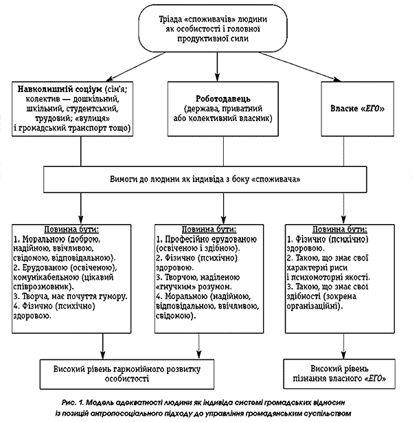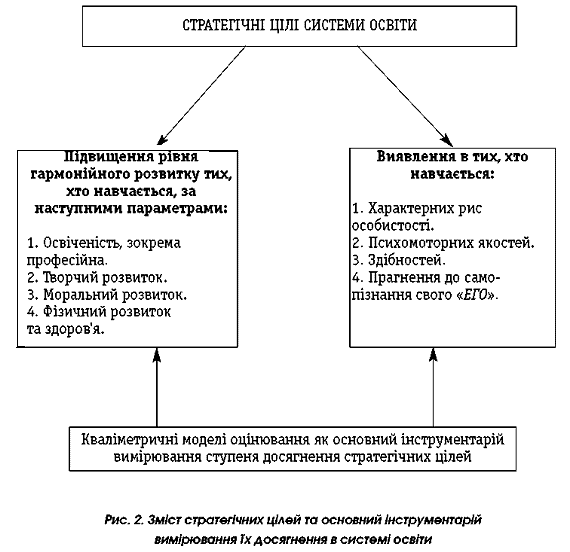 Друга: слід висвітлити підходи до стратегічної спрямованості розвитку системи освіти через чітке визначення її цінного кінцевого продукту. Третє: потрібно показати технологію досягнення цього цінного кінцевого продукту системи освіти на основі формування механізму стратегічного (цільового) управління. Відповідь на перше запитання вже наведена в науковій літературі [3; 4; 5]. Коротко ця суть зведена до того, що йдеться про суспільство, яке сприяє самореалізації людини в межах загальнолюдських цінностей і національних традицій. Розглядаючи другу умову з позицій формування такого суспільства треба чітко визначити зміст цінного кінцевого продукту освіти. Це визначення починається з виявлення «споживачів» людини як біосоціальної істоти. На рис. 1 висвітлена тріада таких «споживачів», до яких належить соціум (від сім'ї та вулиці до колективу, де навчається чи працює людина), роботодавець (держава чи приватна особи), власне «ЕГО». Ці споживачі мають вимоги до людини, яким вона повинна відповідати в межах громадянського суспільства. Після цього можна починати формування механізму стратегічного (цільового) управління освітою на основі кваліметричних вимірювань рівня досягнення таких цілей, як складників цінного кінцевого продукту. Формування механізму стратегічного управління освітою: виявлення стратегічних цілей системи освіти на основі кваліметрії Специфіка цілей полягає в тому, що вони завжди конкретні та вимірні (в протилежному випадку вони втрачають зміст через неможливість відслідкувати ступінь їх досягнення і налагодження чіткого зворотного зв'язку в системі управління). Тому труднощі з їх формулюванням завжди існували не лише в системі освіти, а й загалом у системі державного управління*. Якщо досягнення цілей не можна виміряти (відобразити в конкретних показниках), тоді це вже не цілі, а завдання. У цьому випадку мудро вчинили укладачі-розробники Державної національної програми «Освіта» (Україна ХХІ століття), назвавши в 1994 році її стратегічними завданнями «формування освіченої, творчої особистості, становлення її фізичного і морального здоров'я, забезпечення пріоритетності розвитку людини» [1, с. 6]. Ще 1996 року з'явились перші публікації [7; 8] (а згодом [9; 10; 11; 12] та ін.) про кваліметричні вимірювання рівня освіченості тих, хто навчається, а також рівень їх творчості, моральності, фізичного розвитку та здоров'я. Після появи квалі-метричних підходів (кваліметрія — галузь знань про методи кількісної оцінки якісних явищ, яка виникла на початку ХХ століття для вимірювання кількісною мірою якості продукції) зазначені стратегічні завдання вже можна зараховувати до розряду стратегічних цілей. Наприклад, уже можна сформулювати їх як підвищення рівня освіченості (загальної та професійної) тих, хто навчається, підвищення рівня їх творчого, морального, фізичного розвитку та здоров'я. Такі цілі характеризують параметри гармонійно розвиненої особистості, до яких так безуспішно прагнула система освіти за часів радянської влади (і цінний кінцевий продукт, який нині виявив себе повною мірою в системі влади). Оскільки цей рівень вимірюється за допомогою кваліметричних моделей, то досягнення або не-досягнення цілей стає процесом, за яким спостерігають, і може бути реальним фактом результативної діяльності персоналу як безпо