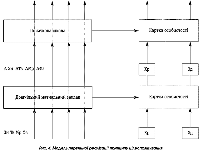Визначальний шлях реалізації стратегії досягнення мети системи освіти Припустимо, що завтра або найближчим часом, система освіти отримає необхідний максимум засобів для свого функціонування (включно із підвищенням зарплати педагогічним працівникам дошкільної та шкільної освіти в середньому в три (!) рази). Виникає запитання: наскільки підвищиться ефективність її функціонування з позиції отримання цінного кінцевого продукту? І чи підвищиться взагалі, якщо всі категорії працівників просто трудяться і трудяться, і не бачать кінцевої мети, а тому нерідко бездарно розтрачують свою конкретну та абстрактну (інтелект, час, нерви) працю на ниві освіти. Вирішення проблеми організації доцільної діяльності персоналу органів управління і закладів освіти є визначальним способом досягнення стратегічних цілей усієї системи освіти на етапі формування громадянського суспільства. Для того, щоб організувати доцільну трудову діяльність будь-якого працівника, необхідно домогтися, щоб його конкретна праця була завжди корисною, а абстрактна — раціональною. Корисність конкретної праці визначається задоволенням будь-якої потреби, що має суспільний характер. Нескладно зробити висновок: якщо кожен працівник прагнутиме досягнення мети (цінного кінцевого продукту), тоді його конкретна праця буде корисною. Відповідно абстрактна праця такого працівника буде раціональною в тому випадку (тобто працівник не буде перенапружувати свій інтелект, психіку та витрачати зайвий час), якщо він перебуває на «своєму місці» і мотивований робити свою роботу якнайкраще. Іншими словами, якщо він відповідає за своєю професійною підготовкою, своїми діловими та особистими якостями обійманій посаді та глибоко зацікавлений у досягненні високих результатів. Для цього потрібен механізм цільового управління через послідовне формування відповідної управлінської культури. Необхідно змінити діючу культуру адміністративного управління на цільову адаптивну управлінську культуру, що базується на послідовній реалізації квадри засадничих принципів за допомогою відповідного методичного інструментарію. Цю квадру становлять принципи цілеспрямування; зворотного зв'язку за результатами діяльності; цілеорієнтовної мотивації трудової діяльності; адекватності кожного працівника обійманій посаді. Під час переходу до культури цільового управління принцип цілеспрямування має виняткове значення. Спробуємо розглянути його реалізацію на прикладі базового ступеня системи освіти — дошкільної та початкової школи. Пропонуємо вимірювати рівень освіченості (знань), рівень творчого, морального та фізичного розвитку дитини під час вступу її в дитячий садок. Технологічно це здійснюється через відповідне тестування, крім оцінки рівня морального розвитку. Остання формується на основі інформації від батьків, які спостерігають за поведінкою своєї дитини у ставленні до себе та інших дорослих, дітей, природи. Крім того, батьки можуть надати першу інформацію про ті характерні риси та здібності своєї дитини, які вони помітили. Усю надану інформацію записують у картці особистості дитини. Упродовж перебування в дитячому садку ведуть систематичне спостереження динаміки параметрів гармонійного розвитку особистості кожної дитини і виявлення її характерних рис (Хр) та здібнос