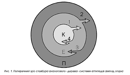 Інтелектуальні почуття як частина структури аттитюду та їх функціонування в системі когнітивної діяльностіАнатолій КОНЬКОВ, кандидат медичних наук, доцент Херсонського інституту МАУП Формування конкретної психологічної установки, тобто специфічного стану, який характеризує готовність суб'єкта «до здійснення певної діяльності, спрямованої на задоволення його актуальної потреби» [5, с.170], відбувається в руслі суспільної дійсності. Саме соціальне середовище, як вважає Д. Узнадзе, сприяє інтеграції життєвого досвіду людини. Результатом такого безперервного процесу, який триває значну частину життя індивіда, є формування в свідомості системи фіксованих установок. До того ж особливо значна їх кількість виникає на ранніх етапах соціалізації (в період дошкільного дитинства та в роки отримання загальної середньої освіти). Пізніше деякі сформовані установки безслідно зникають, але інші зберігаються досить тривалий час, іноді все життя, і готові актуалізуватись за відповідних умов. Визначне місце серед збережених фіксованих установок отримують ті з них, які спрямовані на цілі і засоби діяльності в суспільній системі. У соціологічній літературі за такими соціально фіксованими установками закріпився спеціальний термін — атти-тюд (від франц. «аttitude» — поза, положення). Соціологічна і психологічна література досить багаті на визначення поняття «аттитюд». Однак, серед усіх цих дефініцій особливою повнотою і розгорненням відрізняється визначення, яке запропоновано американським соціальним психологом Дж. Олпорт: «Аттитюд є стан свідомості і нервової системи, який характеризує готовність і виник завдяки попередньому досвіду суб'єкта. Ця готовність виражається у спрямовувальному динамічному впливі на реакції суб'єкта відносно всіх об'єктів і ситуацій, до яких вона має стосунок» [6, с.170]. Порівнюючи смислові значення даного визначення і визначення установки, яке наводить Д. Узнадзе, можна досить легко переконатись, що поняття «аттитюд» і «установка» мають близьку генетичну схожість. Але, незважаючи на це, поставити знак рівності між ними не можна. Зробити це не дозволяє чітко виражений соціальний мотив, який надає кольору поняттю «аттитюд». Аби розвинути таку думку слід зазначити, що зародження й існування аттитюду як психічного утворення можливо тільки в умовах суспільної дійсності, яка виконує в даному випадку одночасно роль живильного середовища і каталізатора. Але, якщо це так, то неминучим стає висновок, згідно з яким аттитюд, на відміну від установки, є більш тонким інструментом дослідження соціально обумовлених проявів особистості. Він не замінний, зокрема при аналізі ціннісних орієнтацій, оскільки останні «виражають потреби індивида в соціально (підкреслено мною. — А. К.) значущих цілях у засобах діяльності» [1, с. 42]. Однак починати таку аналітичну роботу необхідно лише впевнившись у тому, що методичні прийоми застосування аттитюду ефективні. У свою чергу відчуття впевненості може виникнути тільки в результаті детального вивчення структури і функціональних особливостей, що властиві аттитюду як психічному утворенню. Досить глибокий і ретельний аналіз структури аттитюду зробили американські психологи Д. Катс і Д. Креч. Їм вдалося встановити, що аттитюд, як психічне утворення, містить три чітко виражених компонен