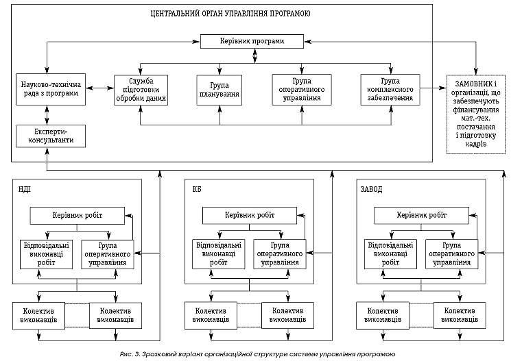Таблиця розподілу відповідальності під час реалізації основних функцій управління між рівнями керівництва може бути основою для визначення вимог до якісних характеристик виконавців і кількісних характеристик комплексного забезпечення реалізації функцій управління (завдання 3 і 4.1). Вирішення першого завдання зводиться до визначення стійкого набору елементарних ознак, наявність яких необхідна для виконання відповідної функції або процедури процесу управління у межах заданих повноважень. Із цією метою слід побудувати тезауруси процедур управління, дискрепторами яких виступають ознаки спеціалізації і кваліфікації виконавців. Вирішення другого завдання зводиться до визначення граничних значень для кількісних показників, що характеризують комплексне забезпечення реалізації основних функцій і процедур процесу управління (інформаційне, кадрове, матеріально-технічне забезпечення і т. п.). До них належать, наприклад, такі показники, як вартість, трудомісткість, швидкодія (тривалість реалізації), надійність та ін. Визначення цих вимог може полягати у використанні статистичних методів, або на основі експертних оцінок компетентних спеціалістів. Окреслення можливих варіантів організаційної структури системи управління базується на аналізі характерних рис наявної системи управління, науково-технічного прогресу, традиційних і нових форм організації управління. Для цього аналізовану систему управління слід представити в стандартизованому вигляді, що допускає її зіставлення з моделлю «ідеальної» системи управління (завдання 1.2.). Зіставлення систем дозволяє чітко фіксувати аналогічні й відмінні частини. Наявність частин, що збігаються, свідчить про можливі напрямки вдосконалювання наявної структури органів галузевого або територіального управління. Слід зазначити, що при визначенні варіантів удосконалення структури діючих систем управління (завдання 2.2., рис. 2), які відповідають вимогам, сформульованим на попередньому етапі, мають бути враховані найбільш прогресивні форми організації управління програмами, ефективність яких підтверджена досвідом діючих систем управління, як у нас, так і за кордоном. Зразковий варіант організаційної структури системи управління програмою наведений на рис. 3. Дана структура має три рівні ієрархії. На вищому (першому) рівні ієрархії знаходиться центральний орган управління програмою, який здійснює централізоване управління всіма роботами по програмі, розподіляє фінансові і матеріальні ресурси між організаціями-виконавцями робіт. На другому рівні ієрархії системи управління програмою виділяються організації-виконавці робіт програми. На третьому рівні ієрархії розташовані колективи виконавців, які беруть участь у виконанні робіт програми. У структурі центрального органу управління можуть бути виділені шість функціональних ланок: керівник програми; науково-технічна рада; група планування; група оперативного управління; група комплексного забезпечення; служба підготовки й обробки даних. Керівник програми відповідає перед замовником за реалізацію всієї програми. Він приймає рішення у процесі планування й оперативного управління виконанням основних робіт, включених у програму. Науково-технічна рада являє собою консультативний орган, у складі якого знаходяться експе