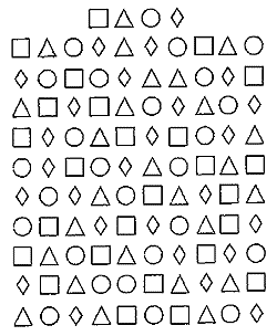 Дослідження концентрації увагиТест Мета дослідження: визначити рівень концентрації уваги. Матеріал і устаткування: бланк тесту П'єрона-Рузера, олівець і секундомір. Процедура дослідження Дослідження можна проводити з однією людиною або з групою (5–9 осіб). Основні умови у випадку роботи з групою: зручно розмістити, забезпечити кожного бланками тестів, олівцями та стежити за дотриманням тиші у процесі тестування. Інструкція випробуваному: «Вам запропонований тест із зображеними на ньому квадратом, трикутником, колом і ромбом. За сигналом “Почали” розставте якнайшвидше і без помилок такі знаки в ці геометричні фігури: у квадрат — плюс, у трикутник — мінус, у коло — нічого не ставте й у ромб — крапку. Знаки розставляйте підряд пос-троково. Час на роботу — 60 секунд. За моїм сигналом “Стоп!” розставляти знаки припиняйте». Випробуваний: ______________ Дата ________ Експериментатор: ___________ Час _________ Бланк із геометричними фігурами тесту П'єро-на-Рузера має такий вигляд: Тест Експериментатор контролює час за допомогою секундоміра і подає команди «Почали!» та «Стоп!» Надійність результатів дослідження досягається повторними тестуваннями, яке краще проводити через значний інтервал часу. Обробка й аналіз результатів Результатами цього тестування є: кількість оброблених випробуваним за 60 секунд геометричних фігур, ураховуючи і коло, і кількість допущених помилок.