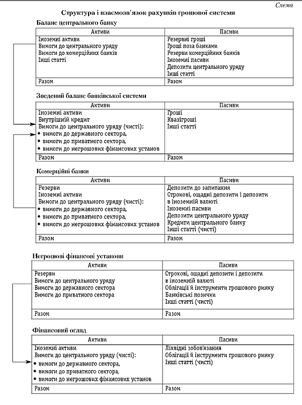Головна стаття банківських пасивів — депозити. Це записи про грошові вкладення, тобто зобов'язання банку перед вкладниками. Крім прийому грошових вкладень, банки збільшують позичкові резерви через отримання позичок від центрального банку і комерційних банків, випуску депозитних сертифікатів та облігацій. Зобов'язання банку за позиками (векселі), проданими депозитними сертифікатами та облігаціями не належать до депозитів, їх розглядають окремо. Резерви — власні та позичкові гроші, якими розпоряджається банк. Вони мають назву фактичних або загальних резервів. Резерви комерційного банку складаються з готівки в касі та його депозитів до запитання в центральному банку. Центральний банк висуває резервні вимоги, утримуючи визначену частку депозитів у комерційних банках на своїх рахунках у формі обов'язкових резервів, які не можуть бути використані комерційними банками для видачі позичок, придбання цінних паперів або інших активів. Резерви комерційних банків у центральному банку за відрахуванням обов'язкових резервів мають назву надлишкових резервів. Фінансові активи комерційного банку, крім обов'язкових резервів, виданих позичок і цінних паперів із обмеженою ліквідністю називаються вторинними резервами. Останні у межах окремого комерційного банку включають надлишкові резерви, короткострокові міжбанківські кредити, міжбанківські депозити і високоліквідні цінні папери в активах банку. Міжбанківський кредит — це продаж надлишкових резервів одним комерційним банком іншому. Обсяг загальних і надлишкових резервів всіх комерційних банків у центральному банку під час цих операцій не змінюється. Вторинні резерви банківської системи перевищують її надлишкові резерви на суму висо-коліквідних цінних паперів. Результати операцій всіх комерційних банків відображають у зведеному балансі комерційних банків. Під час консолідації балансів виключають взаємні вимоги й зобов'язання комерційних банків (міжбанківський кредит та інші кошти в між-банківських розрахунках). Зведений баланс комерційних банків подано у вигляді балансу чистих іноземних і внутрішніх активів, що характеризує фактичний обсяг пропозиції грошей із боку комерційних банків. Зведений баланс банківської системи Зведений баланс банківської системи подають у вигляді балансу чистих іноземних і внутрішніх активів. Він має назву грошово-кредитного, або монетарного огляду. Останній характеризує внутрішні та зовнішні джерела формування фактичного обсягу пропозиції грошей в економіці. Для складання монетарного огляду виключають взаємні розрахунки між центральним банком і комерційними банками. Мета грошово-кредитного огляду — аналіз фінансових агрегатів, за допомогою яких центральний банк і уряд впливають на економіку. Зведений баланс банківської системи