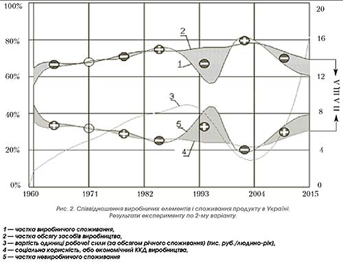 При цьому «хліб» і «масло» поглинатиме так звана «паща», утворена зоною між кривими 2 і 4. Межі, до яких може розкриватися «паща», перебувають між нулем і одиницею. Чим нижчий ККД (крива 4), тим більше розкривається «паща», що вимагає дедалі більше засобів виробництва. Відповідно менше у відсотковому відношенні залишається засобів на підтримку й підвищення рівня життя населення. У другому варіанті зі зміною економічної політики, причому в роки економічної кризи*, показник соціальної корисності виробництва (у табл. останній рядок — варіант 2, на рис. 2 — крива 4) до 2010 р. збільшується в 2010 в 1,5 раза, а до 2015 р. — майже вдвічі. Тут виробничі фонди менші на 10% у 2010 і на 20% — в 2015 р., а продукт П1, споживаний у так званій «невиробничій сфері», збільшується при цьому в 1,5 і 3,5 раза. За раціональної економічної структури потрібно менше засобів для самого виробництва і можна більше виробляти матеріальних благ. У 2-му варіанті виробництво динамічніше, має більше можливостей для підвищення прибутковості у всіх сферах відтворення і збільшення валового продукту П за меншої кількості засобів виробництва Ав (див. табл., варіант 1 і 2). Це аналогічно до того, як у техніці раціональним проектуванням, наприклад, вантажної автомашини досягається зниження її власної ваги, витрат пального і підвищення її корисної вантажопідйомності. Раціональний розподіл вироблених продуктів між сферами відтворення виробничих елементів (робочої сили, знарядь праці, предмета праці) є найефективнішим способом успішного розвитку економіки і підвищення рівня життя населення. Теорія соціалу також дозволяє осмислено підходити до вирішення проблем соціально-економічних перетворень, зокрема, під час розробки проектів переходу до ринкової економіки [5]. У цьому проекті розрахунковим шляхом були визначені терміни (5–6 років), необхідні для проведення реформ засоби (в обсязі 1–1,2 річного ВВП країни) і внутрішні джерела їх отримання, етапи перетворення системи економічних механізмів функціонування народного господарства в цілому, а також нульові етапи підготовки реформ. Здійснення бо перебудови лише методом «проб і помилок» обходиться народам невиправдано дорого. Можна не тільки прогнозувати, а й проектувати економічний розвиток, як для вирішення сьогочасних завдань, так і для передбачення можливих проблем у майбутньому. Уже зараз необхідні плани розвитку на 25 і більше років. У недалекому майбутньому при використанні космічних технологій можуть знадобитися плани на багато десятків і навіть на сотні років. Теорія соціалу, що ґрунтується на універсальних законах економіки виробництва, є універсальним науковим інструментарієм і дає економічній науці експериментальний зміст. Вона дозволяє розробляти економічні високі технології та аналізувати економічні процеси в лабораторних умовах. Без створення таких технологій важко обходитися нині і зовсім не можна буде обійтися завтра.