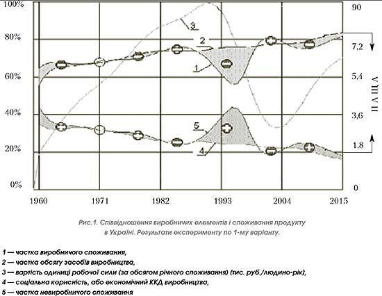 У першому варіанті розподіл вироблюваних продуктів із 1960 по 2015 р. узятий таким, яким воно було в УРСР з 1960 по 1990 рік. Тут превалювала група «А» над групою «Б», і при зростанні ВВП переважно нарощуються засоби виробництва. У цьому варіанті показник соціальної корисності виробництва (у табл. передостанній рядок — варіант 1, на рис. 1 — крива 4) зі зростанням ВВП знижується з 0,45 в 1960 р. до 0,18 в 2015 році.