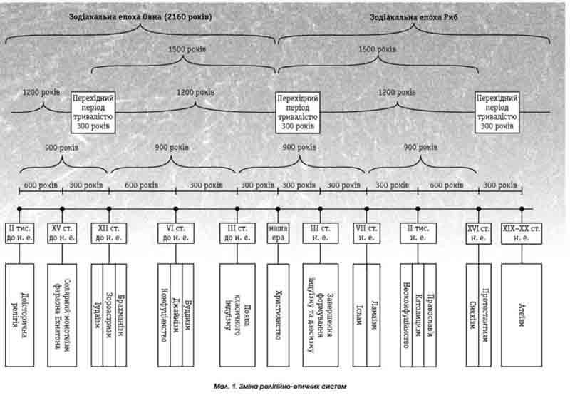 Закони світової історії і соціальної динамікиГеогій ЩОКІН Зміна релігійно-етичних парадигм як закон соціальної історіїМ. Вебер класифікував релігії — головну основу цінностей і найвищі регулятори суспільного розвитку — залежно від того, які цінності і соціальні страти були основними виразниками цих віровчень. Наприклад, в індуїзмі — це чернець, який впорядковує світ (духовний стан); у конфуціанстві — бюрократ, що прагне організувати навколишній світ (аристократичний стан); в іудаїзмі — мандрівний торговець, що має прибуток (торгово-лихварський стан); у християнстві — ремісник, що створює різні блага (виробничий стан) [2]. Звідси, згідно з М. Вебером, магічно-культові елементи найбільш характерні для релігії землеробських народів і — у межах цих культур — для селянського стану; віра в долю, рок, характерні для релігії народів-завойовни-ків і військового стану, раціоналістичний характер має релігія міських верств, які меншою мірою ніж хлібороби залежать від природних умов і більшою — від ритмічно організованого способу життя. Однак, оскільки релігійні системи, як правило, виникають і поширюються не серед однієї верстви, то в них присутні у своєрідних поєднаннях різні елементи. При цьому особливу увагу М. Вебера привертала релігія паріїв, тобто груп, які перебувають на найнижчому щаблі або навіть поза соціальною ієрархією. Носіями «релігійності паріїв» є збіднілі і занепалі вихідці з більш привілейованих соціальних прошарків, тобто люмпени і марґінали, орієнтовані, як правило, на здійснення соціальних революцій. Науковець класифікує релігії і за принципом їхнього ставлення до світу: для конфуціанства, наприклад, характерне прийняття світу і навпаки, запереченням світу характеризується буддизм. Деякі релігії (християнство, зороастризм, іслам) приймають світ на умовах його виправлення. Від того, чи приймається світ і якою мірою, залежить ставлення релігії до сфери політики, тобто до влади і насильства. Релігія, що відкидає світ, як правило, аполітична, оскільки виключає насильство (тут найбільш послідовний буддизм, а також християнство, для якого характерні ідеї ненасильства). Там, де світ цілком приймається, релігійні погляди легко погоджуються зі сферою політики (іудаїзм, наприклад); містико-магічні релігії взагалі не вступають у протиріччя з політикою [2]. Вивчення соціальної історії переконливо свідчить про періодичну зміну релігійно-етичних систем і домінуючу соціальну роль їхніх носіїв. Так, Мойсей і Зороастр, вихідці зі жрецького середовища, були останніми реформаторами, які намагалися близько ХІІ ст. до н. е. зберегти панування теократії. Цілою хвилею виступів проти жрецтва характеризувалося VI ст. до н. е., коли представники світської аристократії (Будда і Махавіра в Індії, Конфуцій і Лао-Цзи в Китаї, Піфагор у Греції) заснували нові релігійно-етичні системи (буддизм, джайнізм, конфуціанство, даосизм, орфізм). У період від ІІІ ст. до н. е. до ІІІ ст. н. е. на основі ортодоксальних ведичних традицій сформувався класичний індуїзм, що став релігією не лише жерців і аристократів, а насамперед — широких прошарків населення. На початку нашої ери переможний рух планетою почало християнство, що також опирається на народні маси, а в VII ст. виник іслам, що поширився в арабському світі і призвів до його бурхливого розширення (див. 