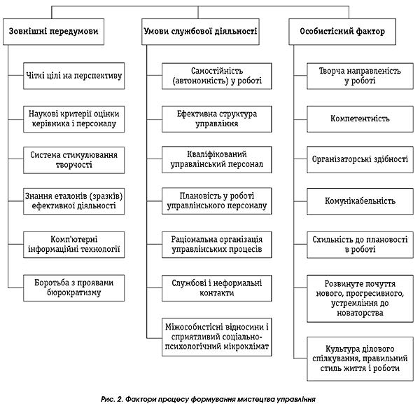 Отже, хоча управлінська діяльність є мистецтвом, яке, однак, базується на наукових принципах. Процес формування мистецького управління пов'язаний з трьома групами факторів (рис. 2.): 1) зовнішні передумови; 2) умови службової діяльності; 3) особистісні фактори. Основою управлінського мистецтва є конкретний приклад, ситуація, зразок, у яких демонструється певна управлінська проблема і дається метод її вирішення. При цьому основним методом управлінського мистецтва є описовий, емпіричний, на відміну від логічного, притаманного теорії керівництва. Опис кращого досвіду господарювання, успішного вирішення проблеми розвитку виробництва має не тільки історико-пізнавальне значення, а й практичну цінність, оскільки чимало положень не втратили своєї актуальності в сучасних умовах. Однак, слід зважити на те, що вибір і узагальнення дійсно нового, прогресивного — завдання досить складне, оскільки доводиться зустрічатися з великим розмаїттям форм можливого вирішення тієї чи іншої проблеми, складністю в оцінці окремих дій, що забезпечують успіх. Матеріали багатьох управлінських досліджень свідчать про те, що в сучасних умовах конкурентні переваги працівника визначаються накопиченим і задіяним людським капіталом. Саме капітал, втілений у людях, у формі їхньої освіти, кваліфікації, професійного досвіду, новаторського і організаційного таланту тощо визначає можливості і межі необхідних змін. Відповідно, пріоритетними чинниками економічної динаміки стають інвестиції в людський капітал [6, с. 235].