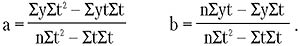 yt = a + bt , де t — порядковий номер часового періоду, який характеризує вплив на залежну змінну всіх інших факторів, зокрема тих, що враховуються та змінюються пропорційно часу.