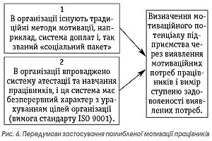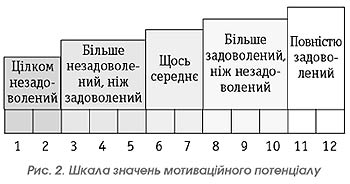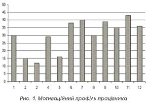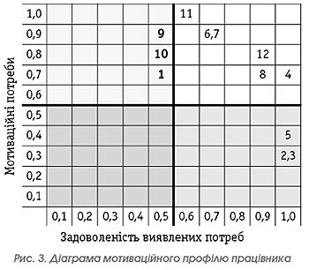 Сама технологія виявлення цих факторів для кожного працівника пов'язана зі спеціальним тестуванням. Тест запропонований Річі Ш., Мартін П. в учбовому посібнику «Управління мотивацією». Коли працівник відповідає на запитання цього тесту, він виражає свою думку з приводу того, який із наведених вище факторів для нього є значимішим за інший через кількість балів. Результати опитування можна виразити діаграмою (рис. 1). Для здійснення наступного етапу потрібно виявити в процесі опитування ступінь задоволеності потреб працівників для кожного фактора. Для цього можна запропонувати ступінь задоволеності фактора розмістити на шкалі від 0 до 1 з кроком 0,1. При цьому значення 0 — відповідає визначенню цілком незадоволений, а 1 — цілком задоволений. Для подальшого аналізу, необхідні бали, отримані під час спеціального тестування, також перевести на шкалу від 0 до 1. Для цього максимальний бал приймається за 1, а інші визначаються через відношення до нього (див. табл. 2) Таблиця 2. Кваліметричні значення значимості факторів і їх задоволеності