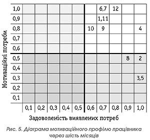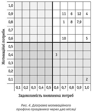 Для визначення мотиваційного потенціалу (Мпрацівника.) цього працівника необхідно додати всі значення ступеню задоволеності (С). Мотиваційний потенціал через ступінь задоволеності мотиваційних потреб визначається з формули: Мпрацівника = С1 + С2 + С3…. +С12 Шкала значень мотиваційного потенціалу така (див. рис. 2) Підставивши у формулу значення таблиці 2, отримуємо значення мотиваційного потенціалу опитаного працівника, яке становить 9,4. За шкалою значень мотиваційного потенціалу видно, що у цього працівника мотиваційні потреби більше задоволені, ніж незадоволені. Щоб зрозуміти, на які мотиваційні фактори необхідно вплинути, значення із таблиці 2 переносять на діаграму, яка поділена на чотири квадрати (рис. 3). По вертикальній шкалі діаграми нанесені значення мотиваційних факторів (Ф), а по горизонтальній — їх задоволеність (С). У першому квадраті значення фактору і задоволеність перебувають у межах від 0 до 0,5. У другому — значення фактора перебуває в діапазоні від 0,6 до 1, а значення задоволеності — від 0 до 0,5. У третьому квадраті значення фактора і задоволеності — в межах від 0,6 до 1. І нарешті, в четвертому значення фактора перебуває в межах від 0 до 0,5, а задоволеності — від 0,6 до 1. За наведеною на рис. 2 діаграмою видно, що для мотивування опитаного працівника насамперед необхідно звернути увагу на фактори 9 (різноманітність і зміни), 10 (креативність) і 1 (високий заробіток), оскільки вони перебувають у другому квадраті діаграми, що свідчить про їхню високу значимість і низьку задоволеність. Через два місяці мотиваційний потенціал цього працівника вже мав значення 10, а діаграма мотиваційного профілю набула іншого вигляду (рис. 4). Було вжито певних заходів, а саме керівництво почало ставити перед працівником завдання, не регламентуючи способи їх виконання. Крім того, відбувся факт незначного підвищення заробітної плати. Отримавши наведені вище результати, можна бути впевненим, що опитаний працівник мотивований. Але не можна гарантувати, що така ситуація триватиме довго. У людини може щось змінитись в особистому житті, може змінитись атмосфера оточення, може змінитись керівник, і тоді для працівника на перше місце виходять інші мотиваційні потреби, які раніше здавалися не важливими. Тому керівництву необхідно не зупинятися на отриманих позитивних результатах, а відслідковувати мотивацію, принаймні, найкращих своїх працівників. Для прикладу на рисунку 5 наведено діаграму мотиваційного профілю того ж таки працівника через шість місяців. У цьому випадку задоволеність виявлених потреб не вийшла на рівень нижчий від значення 0,5, але можуть бути і такі випадки. Наведений у цій статті експеримент був проведений з людиною відповідальною і свідомою. Тому за вісім місяців керівництву довелося лише один раз зреагувати на результати опитування, впровадивши певні заходи. Цього було достатньо, щоб працівник був мотивованим працювати і надалі з віддачею. Очевидно, він належить до тих 10–15% співробітників, які викладаються на 100% незалежно від стану справ у компанії. Як використати запропонований у цій статті метод мотивації до працівників іншого складу? Менеджери повинні проявляти неабияку кмітливість. Ставлячи нові завдання перед таким працівником, необхідно звертати увагу на результати останнього опитування, і вживати заходи, які вплива