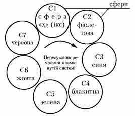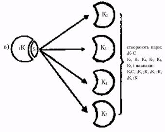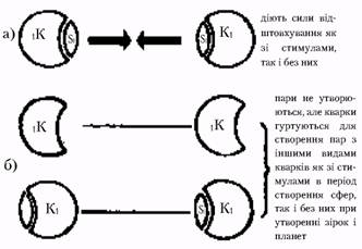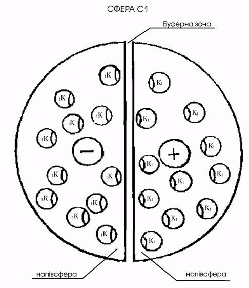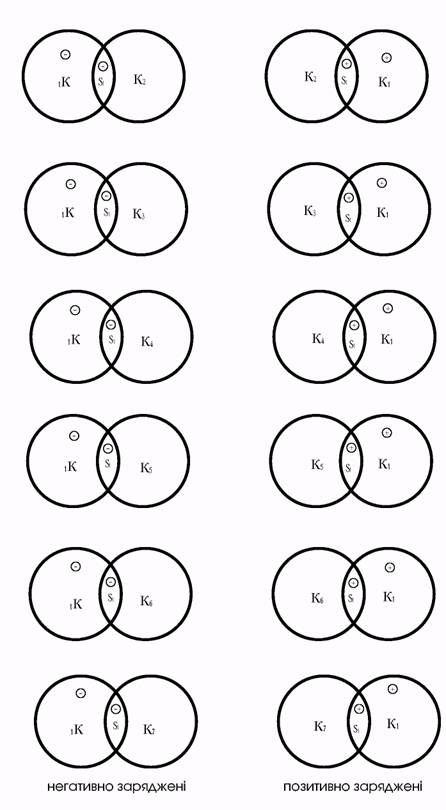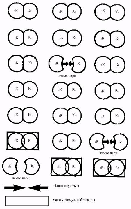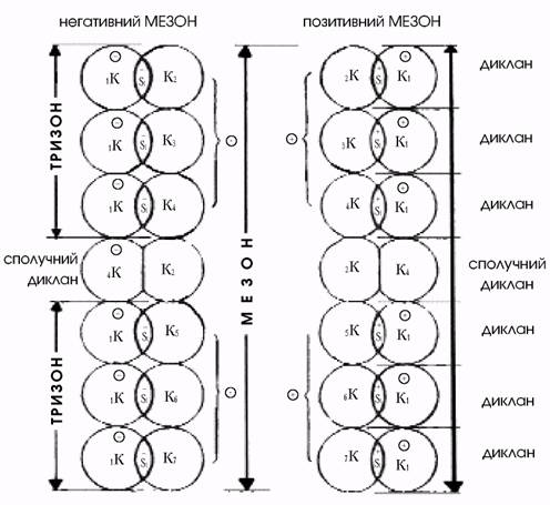 Рис. 3. Сили взаємоАій між кварками різних вид/в (Аля сфери С1) 3. СТРУКТУРНІ СКЛАДОВІЛТОМЛ І СИПИ ВЗАЄМОДІЙ МІЖ ННМН Як уже згадувалося, кварки, з'єднуючись попарно, утворять диклани і ці парні з'єднання мають множину варіантів. Диклани поділяються на дві групи: ті, що мають заряд (рис. 5) і нейтральні (рис. б). Приміром, у сфері СІ до нейтральних відносяться диклани, до складу яких не входять кварки ІК і КІ, тобто, що складаються із двох чужорідних кварків. В кожній сфері може знаходитися шість різних за кольором і ще шість таких же за кольором, але іншої орієнтації на заряд чу-жорідностей, тому виникає безліч варіантів для такого роду парних з'єднань. Однак усі вони будуть нейтральними, тому що об'єднують два чужорідних кварка з протилежно рівними орієнтирами на заряд (рис. б). У своїй сфері домінуючий кварк набуває повного заряду за рахунок приєднаної до нього частки-сти-мулу і коли він спаровується з чужорідним квар- Рис. 4. розпоаіл домінуючих кварків КІ, ІК у сфері по зарядах. CO — стимули Si). Положення в момент утворення сфер ком, який має частковий протилежний заряд, то на їхнє з'єднання поглинається тільки частина його заряду, адекватна частковому заряду чужорідного кварка. Тому такі диклани завжди мають заряд, їх може існувати тільки по 12 варіантів у кожній сфері, із них — 6 позитивних і 6 негативних (рис. 5). У світі елементарних часток для створення будь-якої структурної одиниці речовини необхідні сили, що утримують її складові. У фізиці вони визначені як сили взаємодії. Почнемо з того, що між кварками існує колосальна сила взаємодії і розподіляється вона за наступною схемою: Таким чином, найбільшою тривкістю взаємозв'язків володіють парні з'єднання кварків, і чим більше ускладнюється структура речовини, тим значніше зменшується її тривкість. З однаково заряджених дикланів утворяться більш великі структурні одиниці — ТРИЗОНИ (рис. 7). Тривкість цих з'єднань базується на тому, що в з'єднання вступають тільки три диклана, причому середній утримує два диклана, що у свою чергу підсилюють це з'єднання. Для створення наступної структурної одиниці речовини в кожній сфері — МЕЗОНА*, необхідно мати усі шість варіантів позитивних або негативних дикланів. Іншими словами, повинен складатися з двох однаково заряджених тризонів, але різних за колірним набором чужорідних кварків (рис. 7). З'єднання їх відбувається за допомогою нейт- Рис. 5. Парні з'єднання, що несуть заряди—диклани — в сфері С1 і кварки К<(+) і ІК(-) булуть ламінуючими, тобто «господарями» в цій сфері, а всі інші різновиди за кольором — «чужинцями» рального диклана, що складається з двох чужорідних кварків, які знаходяться між двома тризонами, ізолюючи які — утворить мезон. Він перебуває у шести домінуючих кварків (господарів), що, знаходячись у з'єднанні зі стимулами, мають повний заряд із шести чужорідних — по одному кожного кольору. Крім того, до складу мезонів входить один сполучний диклан, що складається з двох чужорідних кварків. Домінуючі кварки, з'єднані зі стимулами, визначають заряд мезона. Якщо вони мають позитивний заряд, то і мезон буде позитивним, і навпаки, буде негативним, якщо кварки зі стимулами матимуть негативний заряд. Шість чужорідних кварків різних кольорів, у залежності від порядку їхнього розташування, створюють 720 різних варіантів позитивних і стільки ж негатив