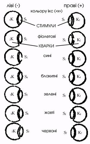 Рис. 2. різновианості кварків і стимулів: праві — позитивні, ліві — негативні